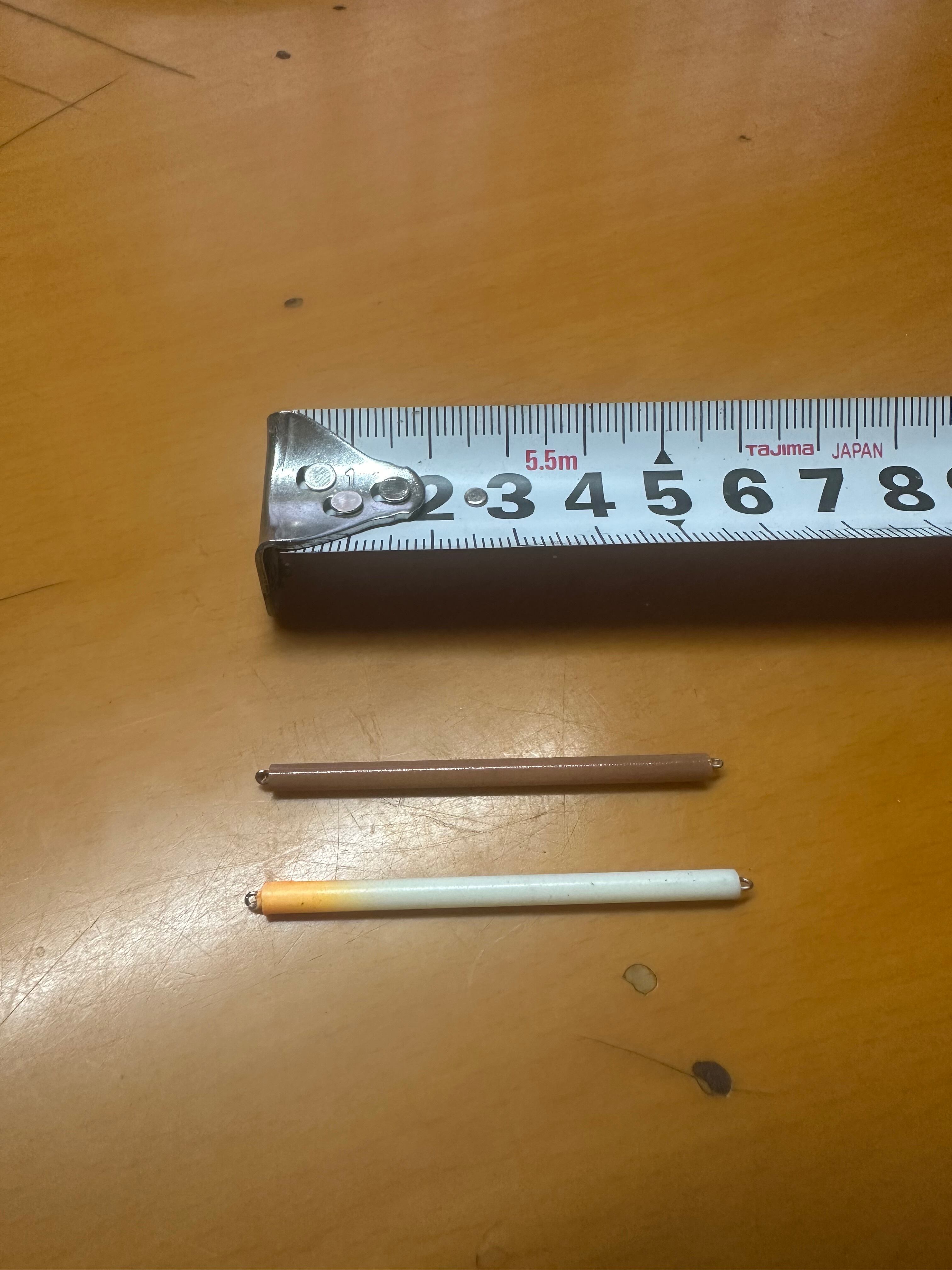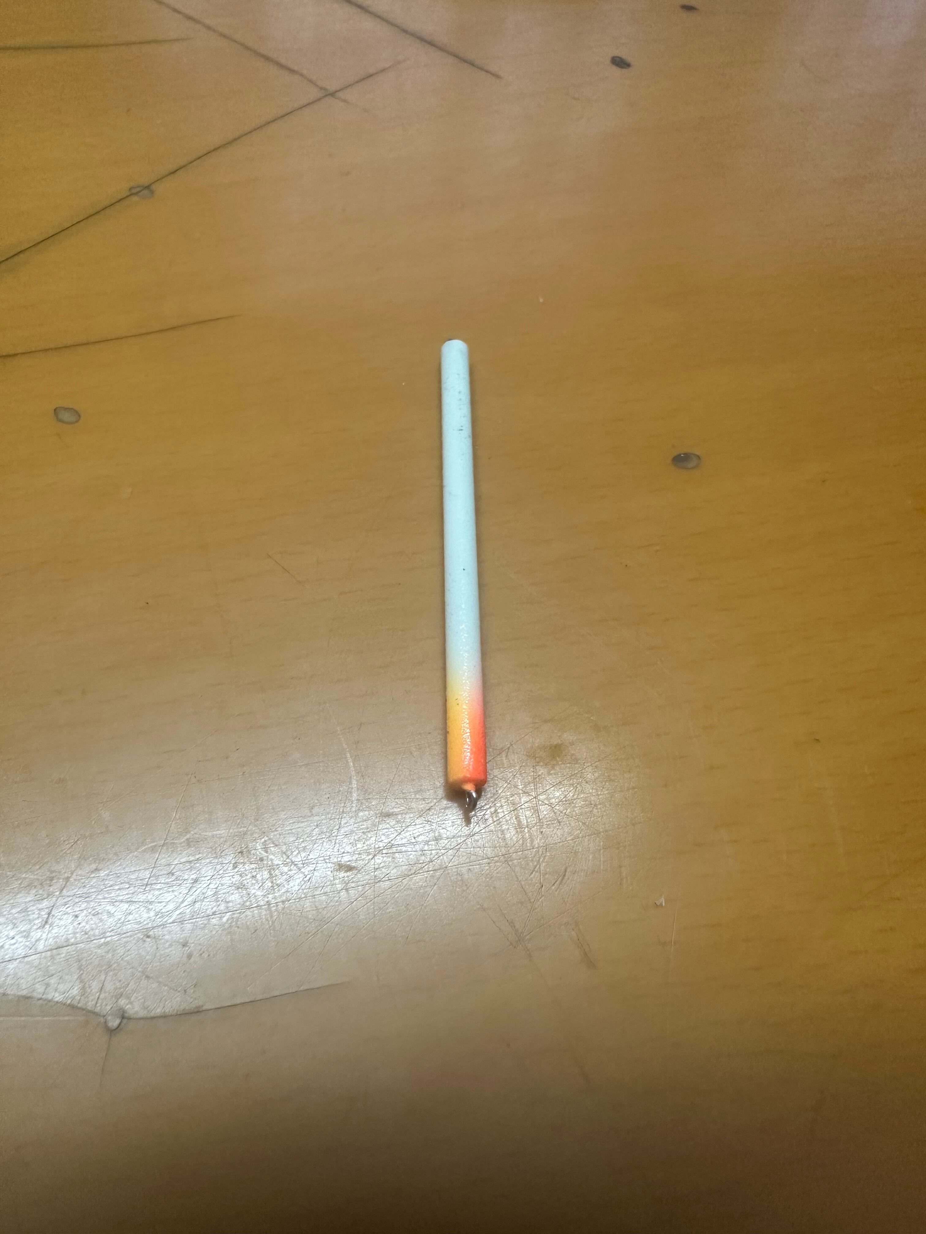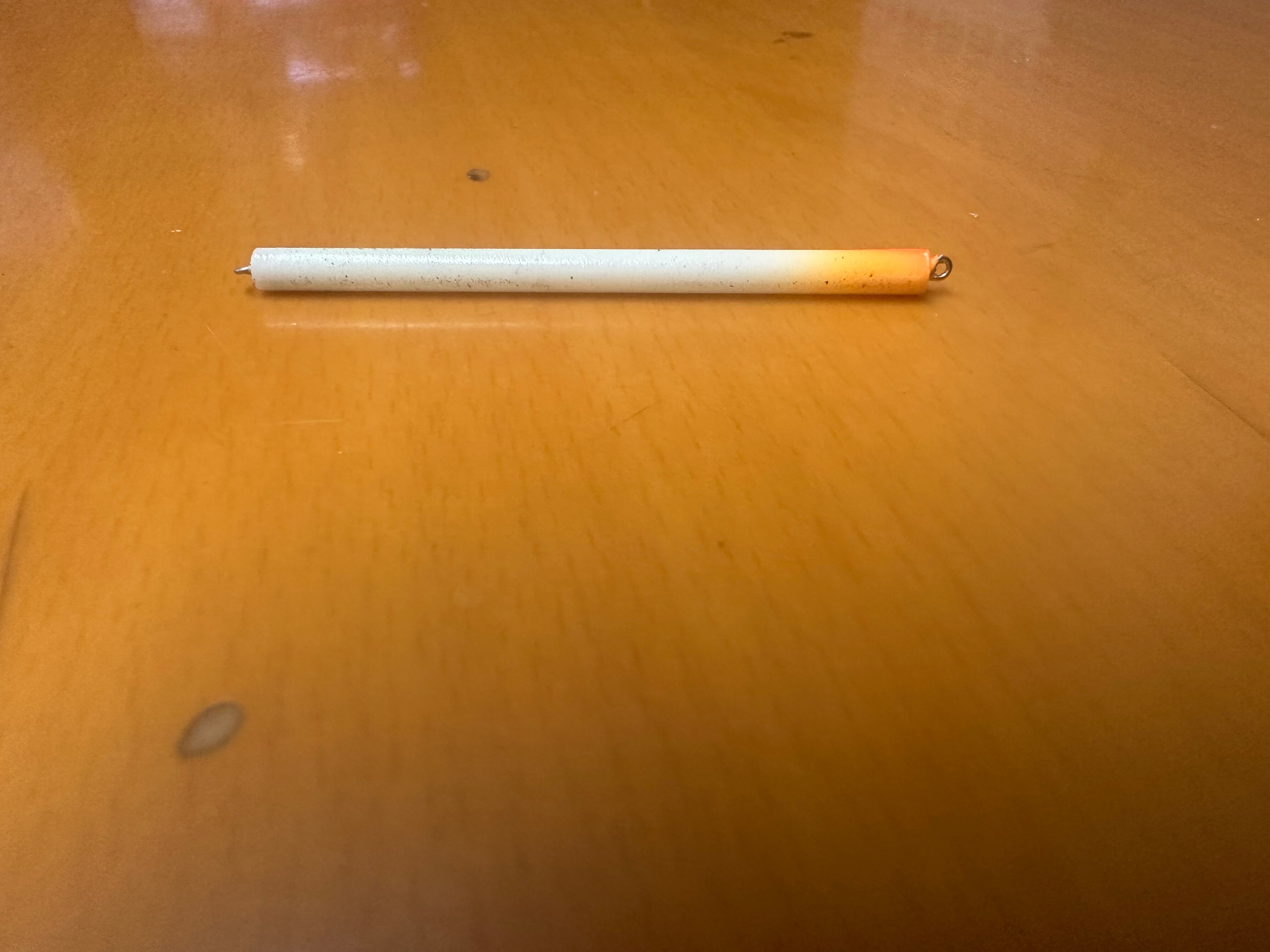バージョン1の贅沢グロー。ボディ長50mm太さ3mm重さ約0.48g。母材は白に近かいグリーングロー。食わせポイントにオレンジグローとレッドグロー。見る位置によってカラーが違うし何より全てのカラーがグローで塗装してあります。使う時間や光量、魚の棚等にドンピシャ来たらヤバいです